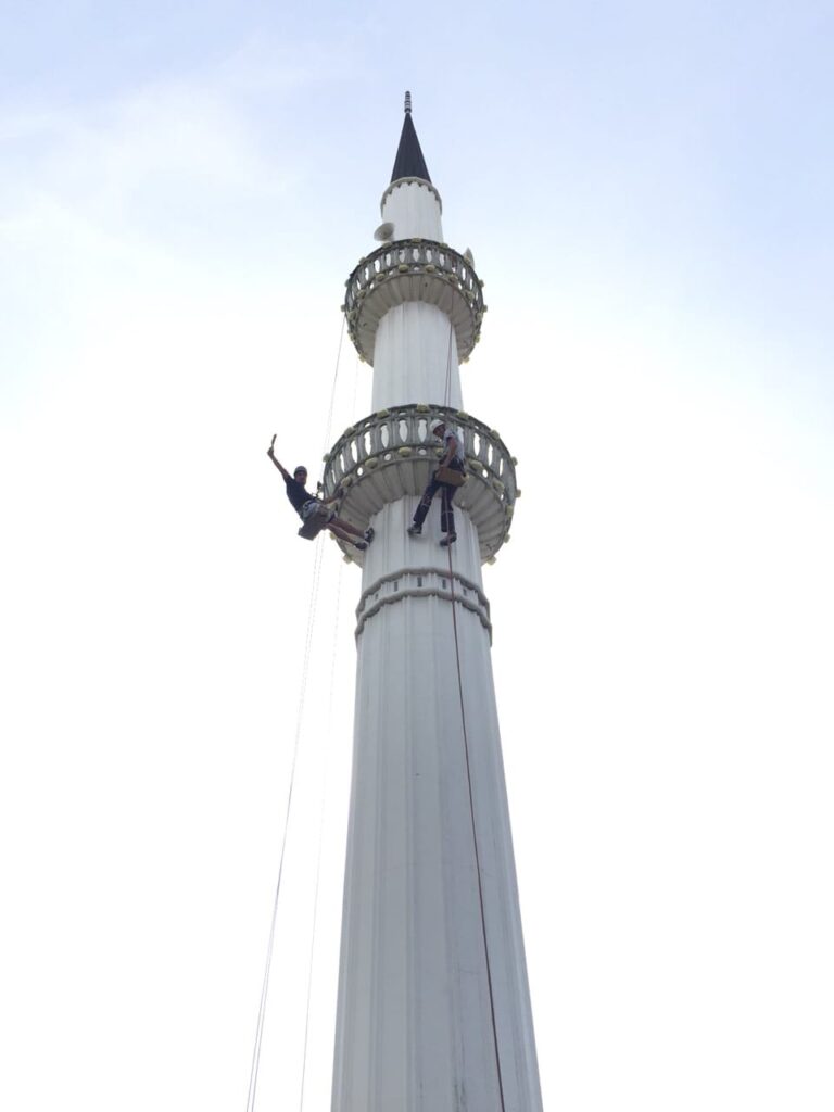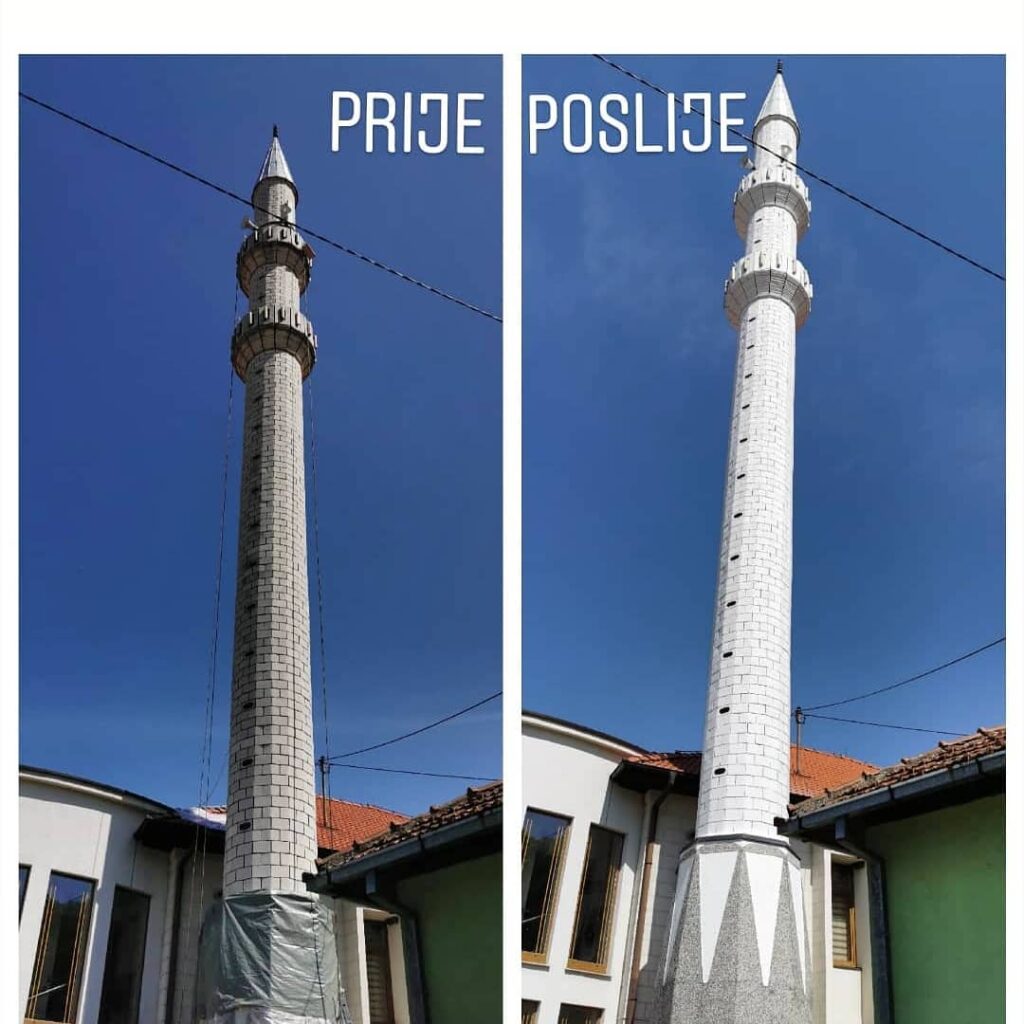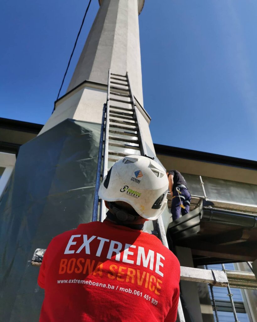 Ekspertni tim za visinske poslove tokom protekle godine sanirao je preko 20 munara po cijeloj regiji Bosne i Hercegovine. Iako je Covid pandemija znatno uticala i na naš biznis, mnogi Džemati širom Bosne su se odlućili na sanaciju svojih munara. Dosta njih je upočetku bilo skeptično za ovakav pristup, ali se na kraju ispostavilo da je mnogo efikasniji od klasičnog pristupa sa građevinskom skelom.U prosjeku našem timu treba 2-3 dana kako bi se izvršila totalna sanacija i farbanje munare. Farbanje se radi pomoću jakih klipnih pumpi od 200 Bar-a,a prije toga vrši se impregnacija sa istim pumpama.